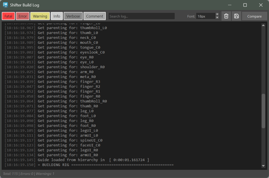The Shifter Build Log Window replaces the old script editor output with a dedicated Qt-based interface for monitoring rig builds. Logs are color-coded by severity, and you can filter, search, and export log output.