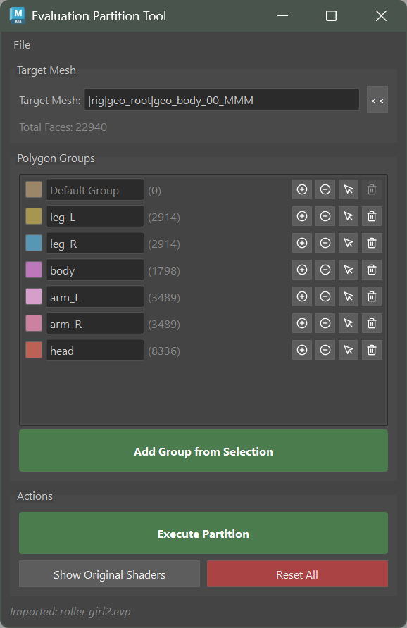 The Evaluation Partition tool splits meshes into polygon group partitions optimized for Maya’s parallel evaluation. On heavy meshes, this can provide a noticeable performance improvement during playback by allowing Maya to evaluate different regions of a mesh concurrently.