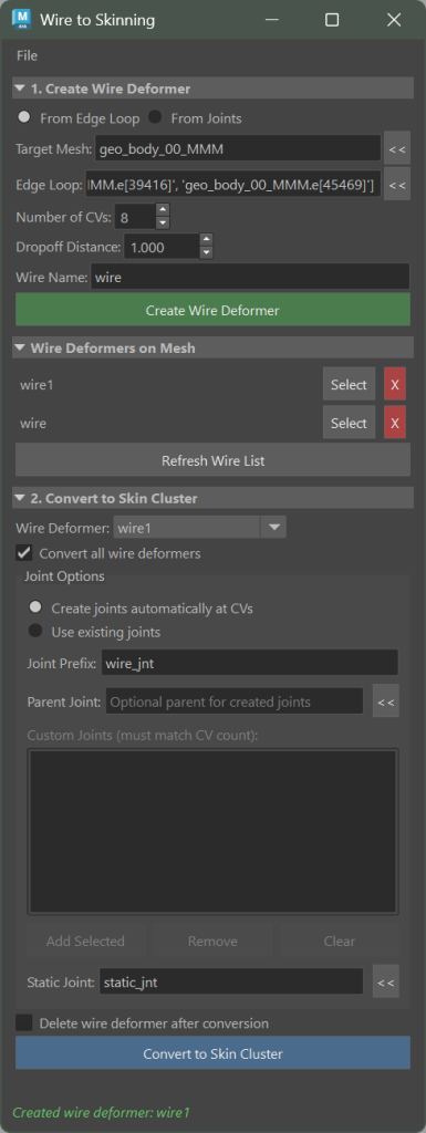 Introduced in 5.2.3, the Wire to Skinning tool converts wire deformers to skin clusters. This bridges a common workflow gap: wire deformers are great for quick shape exploration, but skin clusters are what you need for a production-ready deformation stack.